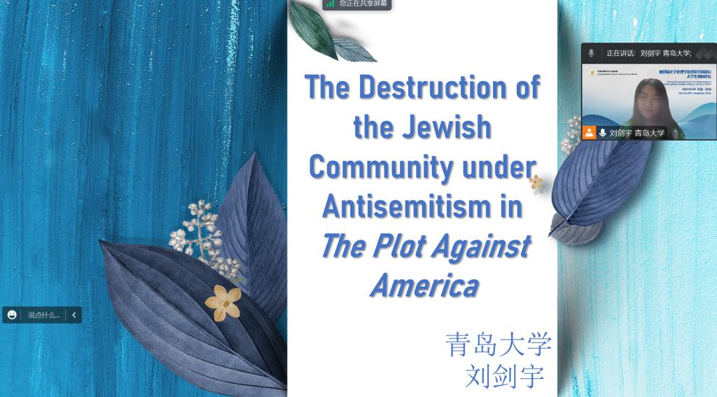 2021级研究生刘剑宇同学在专题论坛“美国文学与文学伦理批评(四)”上作了题为“《反美阴谋》中反犹主义下犹太共同体的瓦解”的论文汇报,论文从民族、社区、家庭角度分析菲利普·罗斯小说《反美阴谋》中所构建的共同体受到的拆解与美国现实生活中存在的“反美”倾向,评委老师肯定了论文的结构层次,同时提出了进一步研究的宝贵建议。