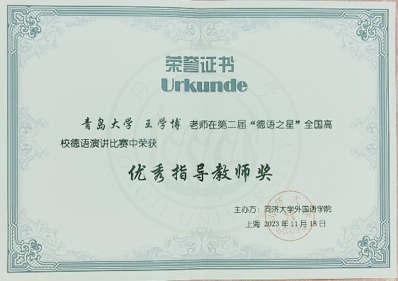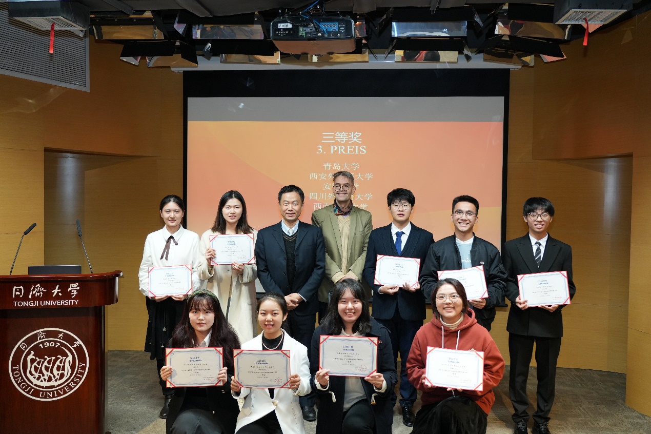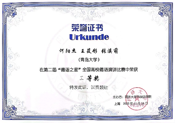 11月18日,第二届“德语之星”全国高校德语演讲比赛决赛在同济大学落下帷幕,十大电子正规游戏官网德语系本科三年级学生何阳杰、王筱彤、张溪萌团队斩获三等奖,指导教师王学博获“优秀指导教师奖”。