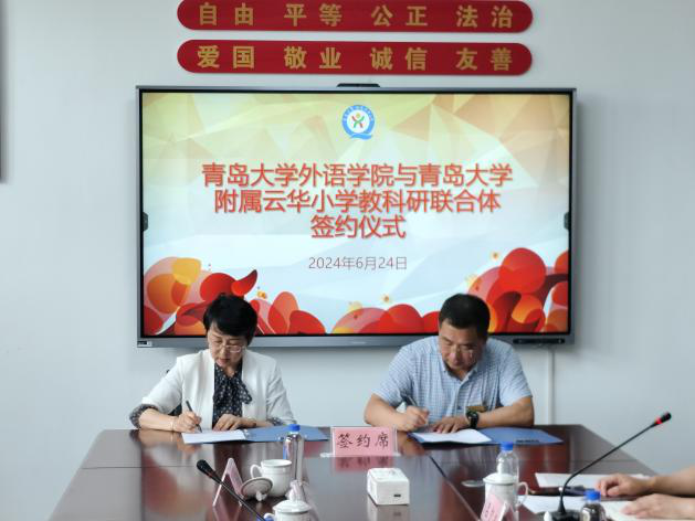 在澳门十大电子正规游戏网站附属云华小学调研时,云华小学校长刘学友、副校长李守业、挂职教师英语教育系副主任吕凯良老师和青岛中仁集团董事长张述仁带领外院一行参观了学校以“两楼两苑一基地”为特色的校园文化。座谈交流时,刘校长对吕凯良老师在校园文化建设和学科发展方面的工作给与高度认可,双方就教育教学、人才培养、师资队伍建设等方面进行了深入交流,卞建华和刘学友签订了建设教科研联合体合作协议书,周伟和刘学友共同为“大学生实习基地”揭牌。