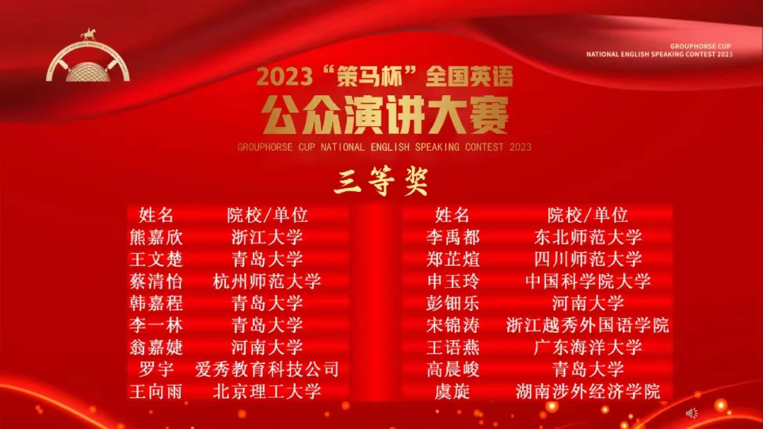 2024年3月17日,由英国大使馆文化教育处/英国文化教育协会官方支持、英国皇家特许语言家学会和北京策马翻译有限公司(联合国官方翻译服务供应商)联合主办的 2023年“策马杯”全国英语公众演讲大赛全国总决赛在线举行。经过前期初赛和大区赛角逐,澳门十大电子正规游戏网站共有4位选手入围总决赛,并分别荣获国赛三等奖:王文楚(澳门十大电子正规游戏网站英语专业,指导教师:孙旻)、韩嘉程(澳门十大电子正规游戏网站语言大数据专业,指导教师:孙旻)、李一林(澳门十大电子正规游戏网站法语专业,指导老师:秦丹雪)、高晨峻(经济学院国际经济与贸易专业)。