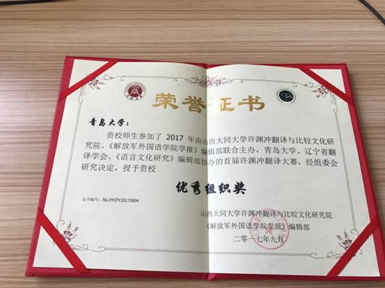 澳门十大电子正规游戏网站荣获“首届许渊冲翻译大赛”优秀组织奖