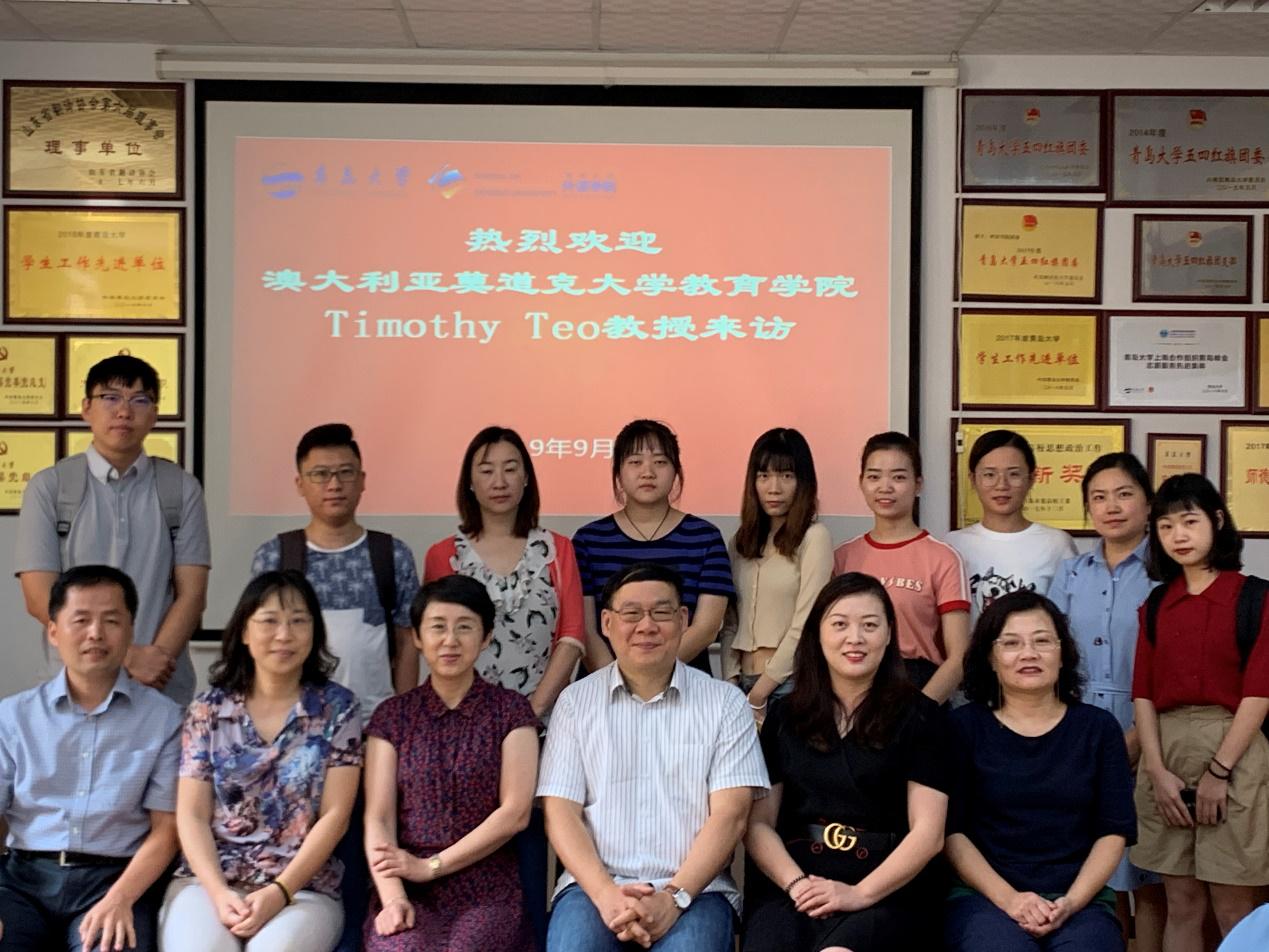 2019年9月6日,澳大利亚莫道克大学教育学院Timothy Teo教授应邀前来学院与老师、同学们探讨研究学术问题及论文发表事宜。此次座谈会在博文楼312会议室举行,黄芳博士担任主持,澳门十大电子正规游戏网站院长卞建华、副院长宫英瑞、布占廷、青岛市教育科学研究院教研员孙鸿、全国优质课一等奖获得者、青岛市第四中学英语教师陆洋,及一众师生参加了会议。