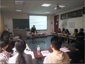 与此同时,在隔壁309教室,另一位来自慕尼黑应用语言大学的老师Klaus Ziegler教授正为德语系老师介绍“ 慕尼黑应用语言大学会议翻译硕士课程入学考试”。报告长达三个半小时,Ziegler教授除介绍考试内容之外,还与德语系老师们就今后如何拓展双方合作,进行了深入交流,并达成初步构想。