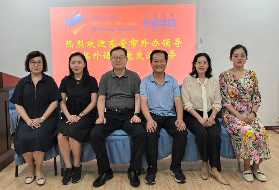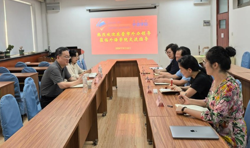 9月13日上午,东营市外办党组书记、主任苏保乾、秘书科科长许丽兰一行前来澳门十大电子正规游戏网站访问交流。澳门十大电子正规游戏网站党委书记陈崇研及院长助理曹杉、英语系主任王薇、翻译研究中心主任迟帅等与客人进行了交流会谈。