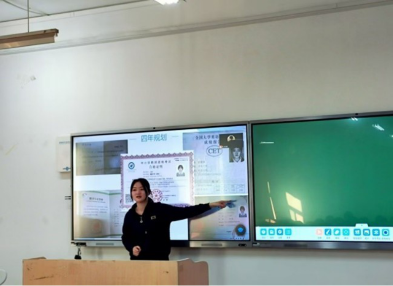 分享交流环节中, 四位学生的代表分别从各自经历出发, 全方面分析在学习过程中的心得体会。她们一致强调大学专业学习成绩的重要性, 就专业课学习和期末复习两方面提出相关建议, 并为在座学生分享了专业课学习和学科竞赛的经验, 介绍了保研的相关政策及时间流程。同时, 董蓉蓉同学作为山东省教师技能大赛的获奖者, 为同学们详细介绍了教师技能大赛的参赛流程、要求及备考经验。她们都提倡同学们注重学历效率、合理利用学习资源、学会交流和请教、丰富大学生活, 以自身经历勉励同学们积极进取。