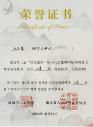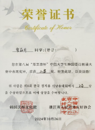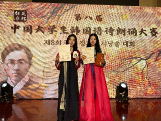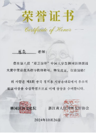 10月26日,第八届郑芝溶杯中国大学生韩国语诗朗诵大赛决赛在杭州师范大学举行。经过一天激烈的角逐,十大电子正规游戏官网朝鲜语系22级学生曾茹月、池天慧喜获二等奖,朝鲜语系崔花老师获得优秀指导教师奖。