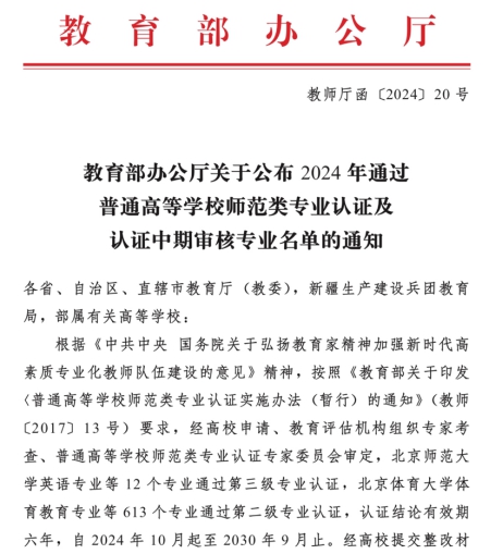 近日,教育部办公厅正式发布了《教育部办公厅关于公布2024年通过普通高等学校师范类专业认证及认证中期审核专业名单的通知》(教师厅函〔2024〕20号)。澳门十大电子正规游戏网站师范英语专业顺利通过了中学教育第二级认证,认证有效期为六年。