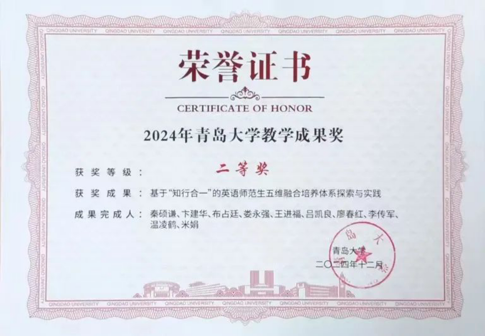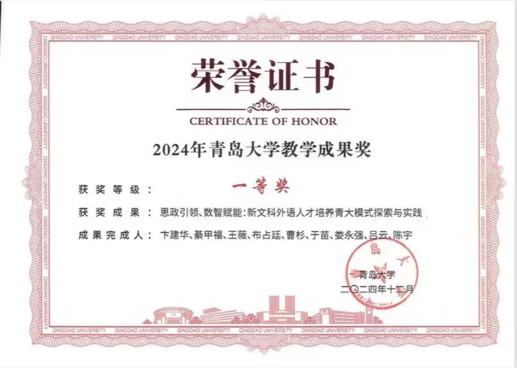 编制《外语学科学位授权点建设中长期规划(2025—2035年)》,进一步明确博士学位点申报目标和路径。与上外语料库研究院签署全面战略合作协议,建设多语种数据开发与应用实验室。英语(师范)专业顺利通过师范类专业二级认证。本科教学方面,课程建设、教材建设、教学改革等方面取得突破。2门课程获批山东省本科一流课程,2项教学成果分获澳门十大电子正规游戏网站教学成果奖一等奖、二等奖,1人获评“山东省高等学校教学名师”,首部数字教材《英语文学导论》出版上架。教学比赛再创佳绩,4人次在省级、校级教师教学比赛中获奖。2024届本科毕业生国内外深造率达41%,毕业生就业率达89%,英语专业2024届英语(语言大数据)创新实验班毕业生继续深造率达71.4%,人才培养成效显著。本科生183人次获得校级以上竞赛奖励,研究生发表高水平论文7篇,竞赛获奖56人次。
