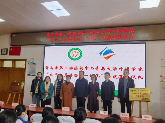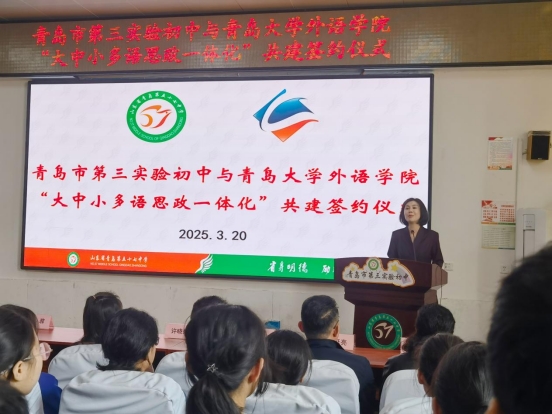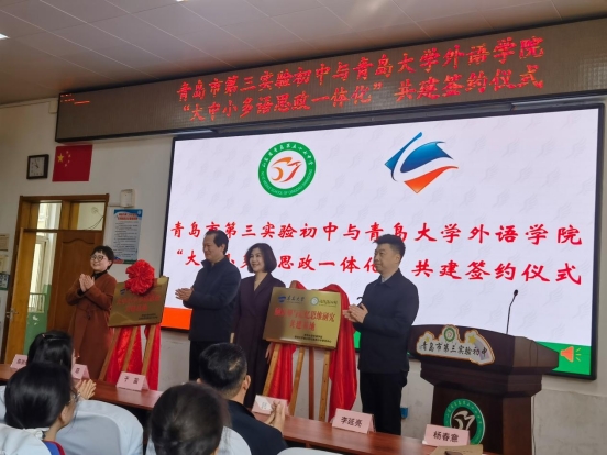 为深化大中小学思政教育一体化建设,3月20日,澳门十大电子正规游戏网站与青岛市第三实验初中联合举办的“大中小学多语思政共建基地”及“脑认知与语言科学研究中心共建基地”揭牌仪式在青岛市第三实验初中举行。澳门十大电子正规游戏网站党委书记陈崇研、党委副书记于苗,市南区教体局党组成员、副局长徐菲、青岛市第三实验初中校方领导等嘉宾出席仪式。