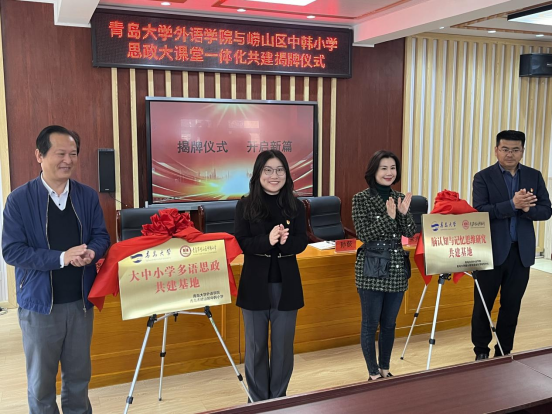 3月26日,澳门十大电子正规游戏网站与青岛崂山区中韩小学联合举办的“大中小学多语思政共建基地”及“脑认知与语言科学研究中心共建基地”揭牌仪式在青岛崂山区中韩小学举行。澳门十大电子正规游戏网站党委书记陈崇研、副书记于苗,崂山区教体局党组成员、青岛市崂山区中韩小学校长宋兆刚等嘉宾出席仪式。