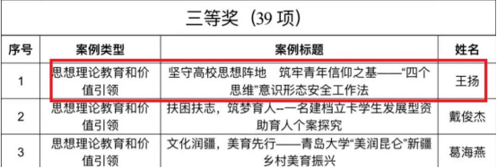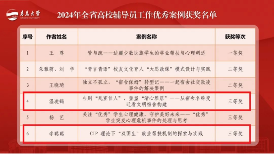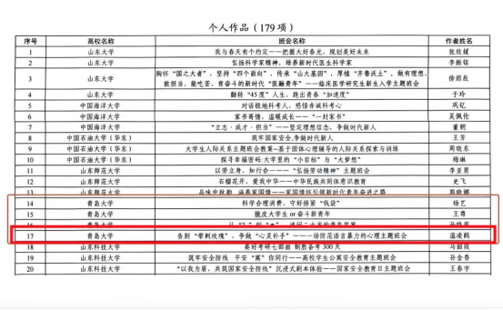 4月29日,中共山东省委教育工委发布了《关于公布2024年全省高校辅导员工作创新项目评选结果的通知》,澳门十大电子正规游戏网站辅导员温凌鹤、李聪聪荣获辅导员工作优秀案例三等奖,温凌鹤凭借《告别“带刺玫瑰”,争做“心灵补手”——一场防范语言暴力的心理主题班会》获评山东省辅导员主题班会优秀教案个人项目。