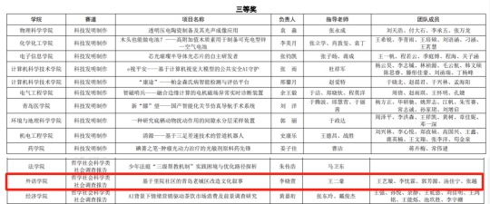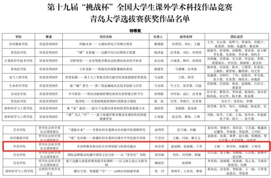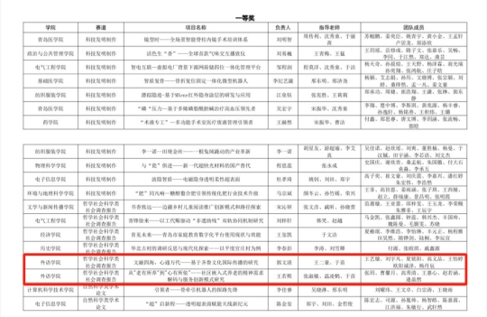 其中,申报的项目《多语种服务驱动社区治理创新与标准化输出》荣获校级特等奖并入围省赛,《文融四海,心通万代——基于齐鲁文化国际传播的研究》和《“从"老有所养"到"心有所依"——社区嵌入式养老的精神需求解码与服务创新模式研究》2个项目荣获校级一等奖;《多语种数据库视角下的汉德理政思维方式对比研究》荣获校级二等奖;《基于里院社区的青岛老城区改造文化叙事》荣获校级三等奖。