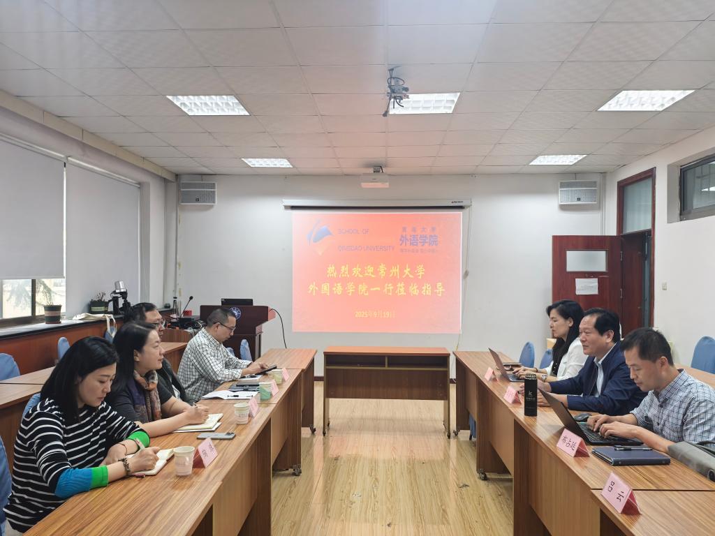 9月19日上午,常州大学外国语学院党委书记薛勇、院长陈颖、副院长尹延安和党政办公室主任陶珠一行四人到访十大电子正规游戏官网进行调研交流。学院党委书记陈崇研、副院长布占廷、曹杉、英语系主任吕云参加座谈交流。