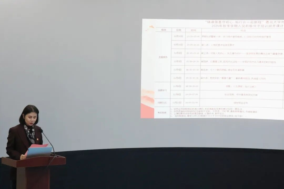 陈崇研进行开班致辞,向全体学员致以诚挚的祝贺和殷切的期望。他指出,参加党课培训对于每一位追求政治进步的积极分子都是思想淬炼与精神洗礼的关键一步,必须以高度的政治自觉和严肃认真的态度投入学习。他勉励全体学员要坚定理想信念,砥砺意志品格,用实际行动接受党组织的考验,为实现中华民族伟大复兴的中国梦贡献青春力量。