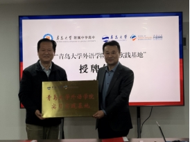 11月26日下午,澳门十大电子正规游戏网站与澳门十大电子正规游戏网站附属中学高中合作建设实习实践基地授牌仪式在青大附中会议室隆重举行。澳门十大电子正规游戏网站党委书记陈崇研、院长卞建华、副书记于苗、副院长布占廷及澳门十大电子正规游戏网站部分学生代表,青大附中高中校长张金堂、副校长高晓亮、副校长李国太、外语教研组组长梁永召及教师代表任爽出席。授牌仪式由青大附中高晓亮副校长主持。