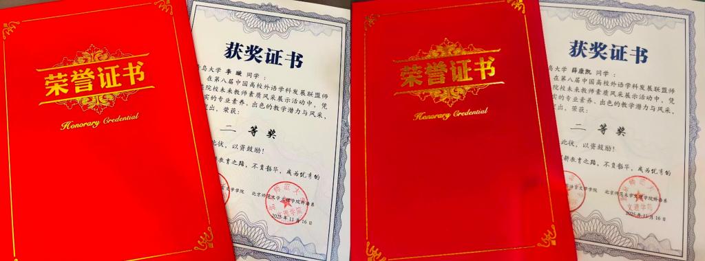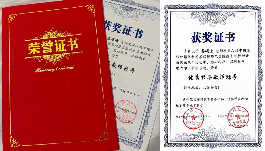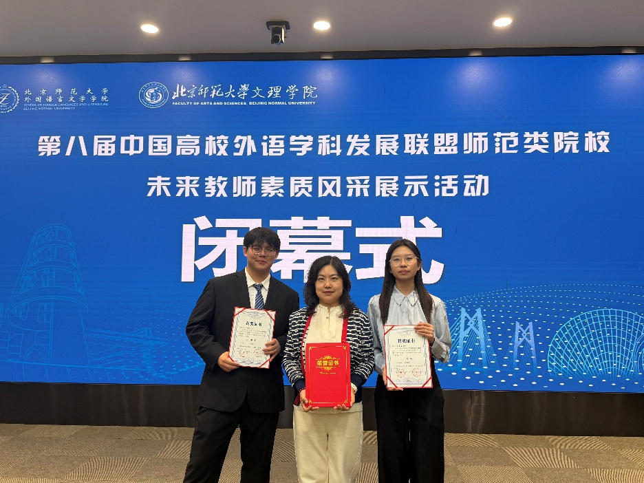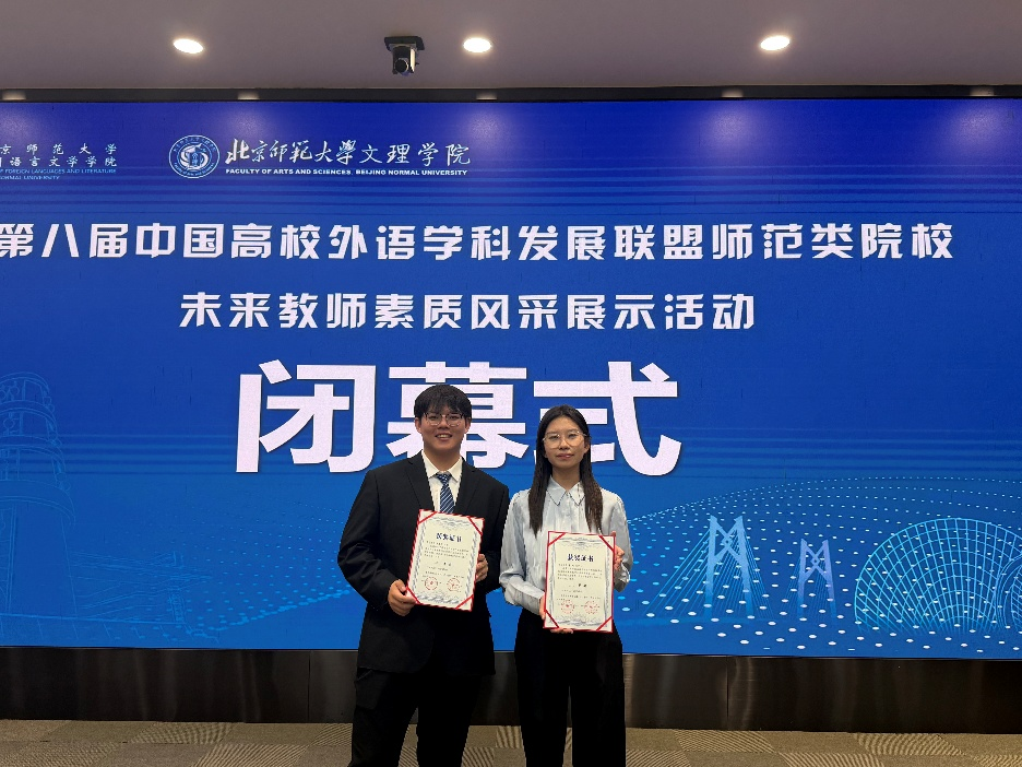 2025年11月16日,第八届中国高校外语学科发展联盟师范类院校未来教师素质风采展示活动在北京师范大学珠海校区圆满落幕。经过全天紧张而激烈的角逐,十大电子正规游戏官网英语师范专业2023级李璇、2024级薛康凯两位同学,在秦硕谦老师的悉心指导下,凭借扎实的专业功底、出色的现场表现和全面的综合素质,从众多参赛选手中脱颖而出,双双荣获二等奖,展现了十大电子正规游戏官网学子卓越的未来教师风采。